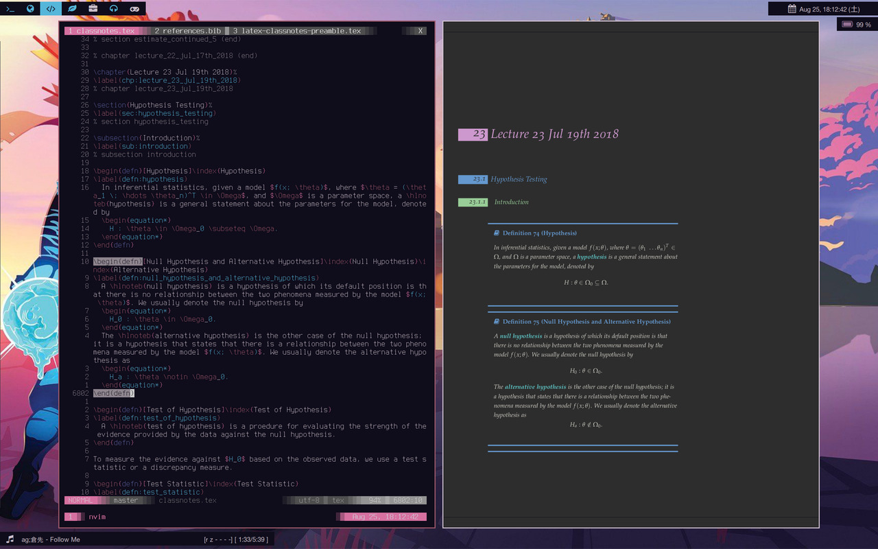 I have also switched to fully writing my notes in neovim neovim is an extension of vim, a powerful text-editor that keeps your hand on the keyboard to get things done, instead of using a mouse, which takes time moving your hands and require you to make precise movements to do one thing. . The biggest reason for the move is really just because all the management work of my $\LaTeX$ workflow are already in the terminal (e.g. git) or are easier/faster to perform in the terminal (e.g. testing a plain pdflatex build, making use of texliveonfly when I need to). Plus, I was already using Neovintageous on Sublime Text, so the switch was quick and easy.